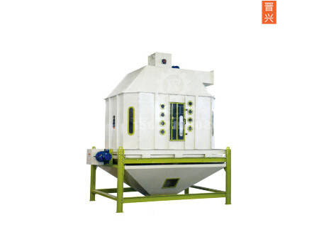 從制粒機出來的顆粒通過冷卻器時,與周圍的空氣接觸,只要大氣處于飽和狀態,就會從顆粒表面帶走水分,顆粒內部的水分在毛細血管的作用下,移至表面,水分在蒸發作用下脫離顆粒,使顆粒得到冷卻。同時被空氣吸收的熱量使空氣加熱,有提高了空氣的載水能力,空氣不斷被風機排出,帶走冷卻期內顆粒料的熱量和水分。
