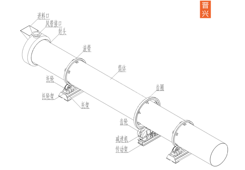 a.托架部分:托架部分包括前托架和后托架,其固定于相應的地基上,用于支撐筒體做定位旋轉。前后托架均由托架、托輪架、托輪組成。安裝時可通過調整前后托架上兩托輪的間距,對設備高度及角度進行調整。